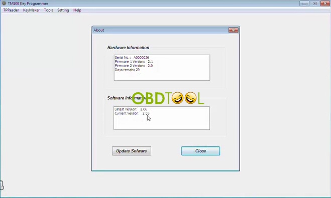 Press Close button after TM100 activation, you will be able to check the TM100 key pro hardware and software version information